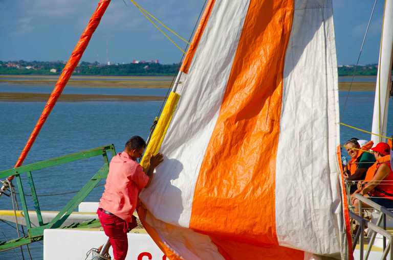 Es un día soleado, como casi todos en São Luis de Maranhao. Hoy nos vamos a Alcântara y el catamarán Luis Novoa nos espera a orillas de la playa Ponta D’areia. Esta vez no saldremos del puerto de la ciudad debido a las mareas, que aquí suben y bajan en promedio siete metros y las aguas pueden retirarse de la orilla por más de tres kilómetros, en un ciclo que se repite cada seis horas.