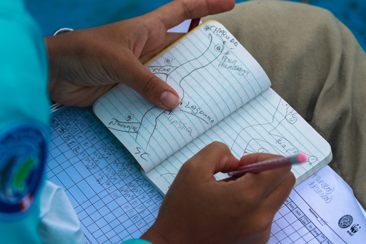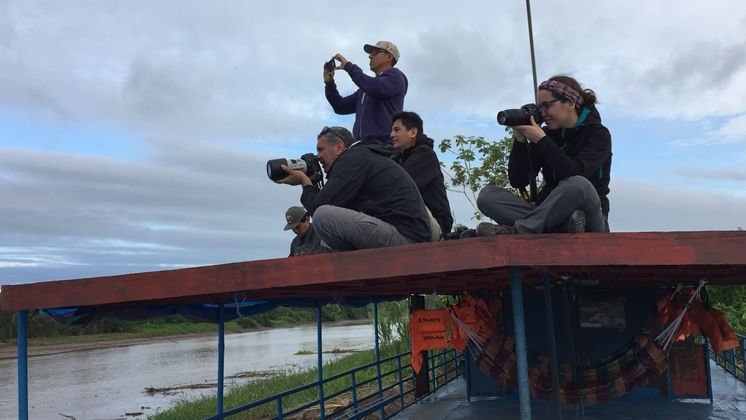 El Wachito I, una motonave capaz de cargar 170 toneladas de peso, ha detenido su navegación para que sus pasajeros, seis científicos peruanos convocados por WWF Perú para monitorear y censar delfines en esta porción del departamento de Loreto, lleven a cabo su trabajo. Diez, doce, quince, veinte delfines evolucionan al lado de la embarcación, la tarde se convierte en una fiesta para los sentidos. Elizabeth Campbell, bióloga con una maestría en la Universidad de Exeter, Gran Bretaña y José Luis Mena, director de ciencias de la ONG conservacionista no dejan de tomar notas.