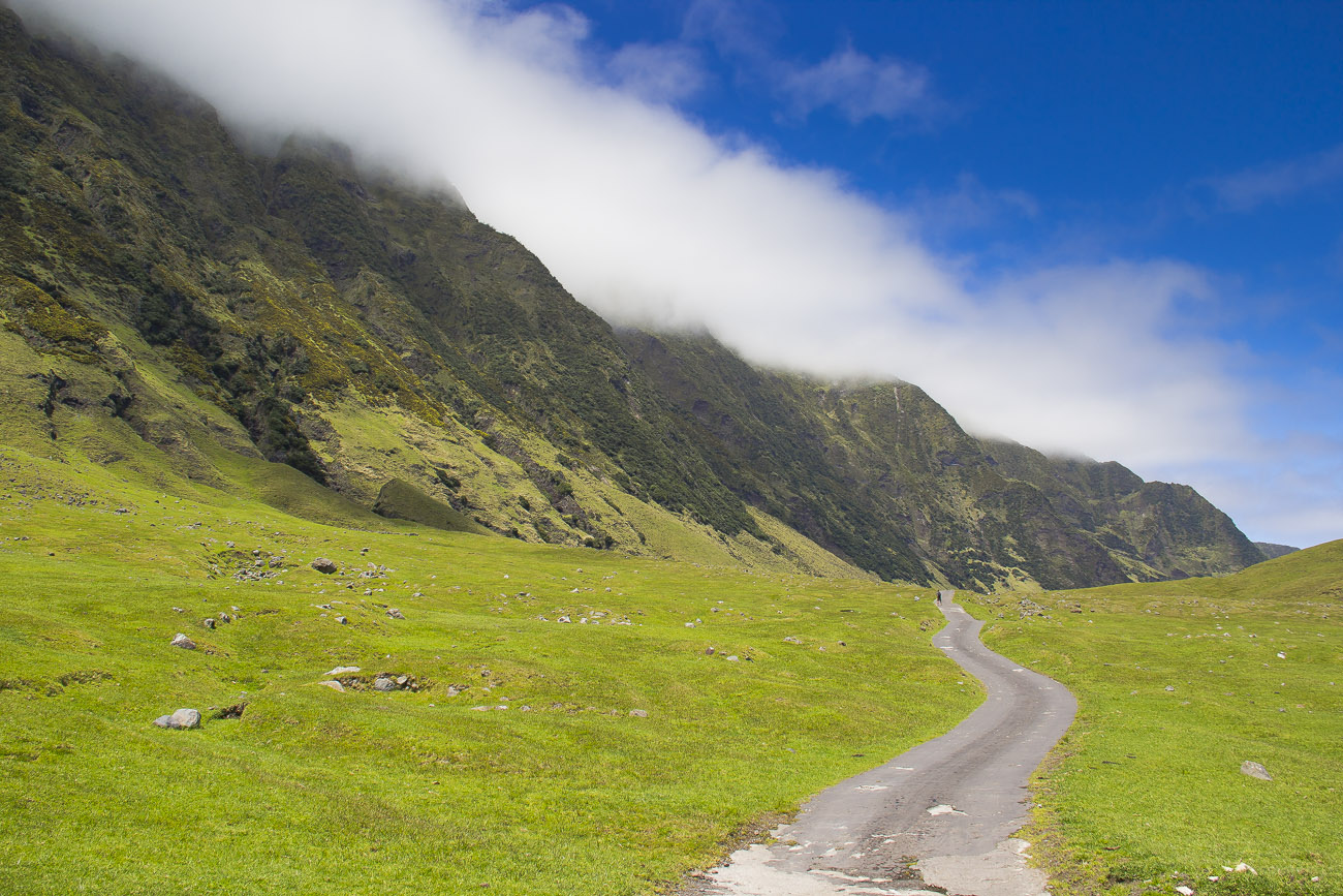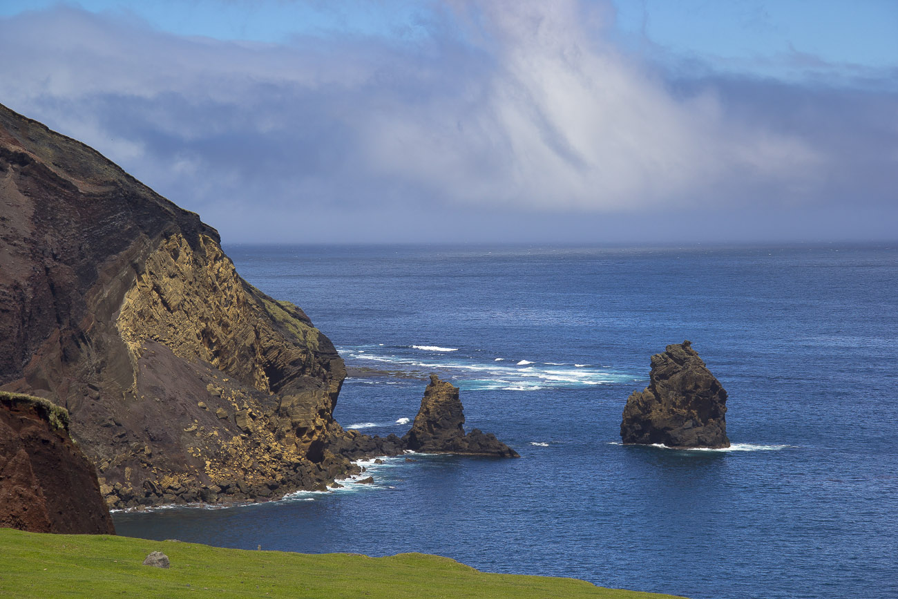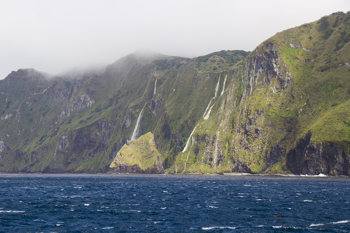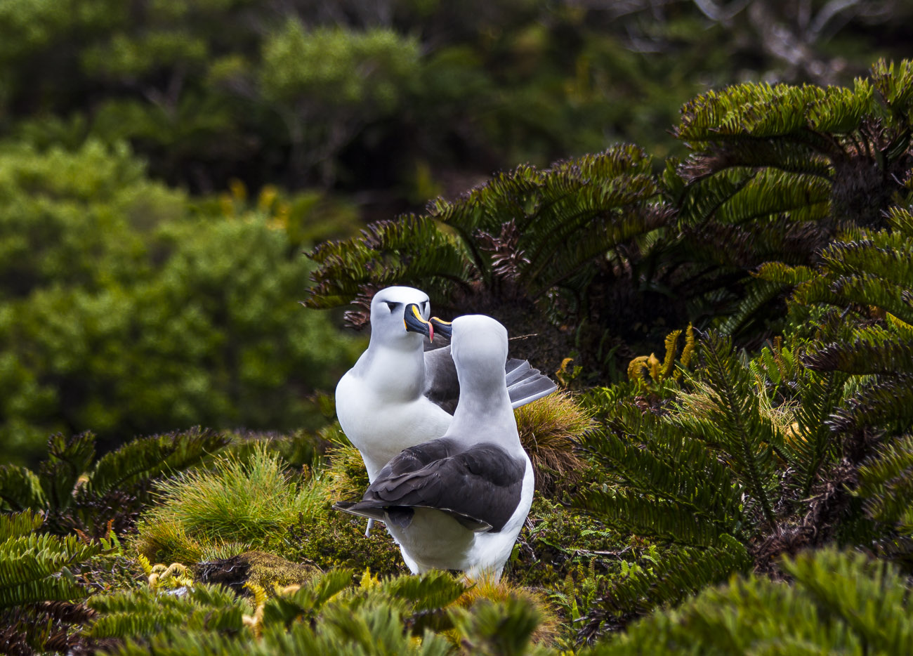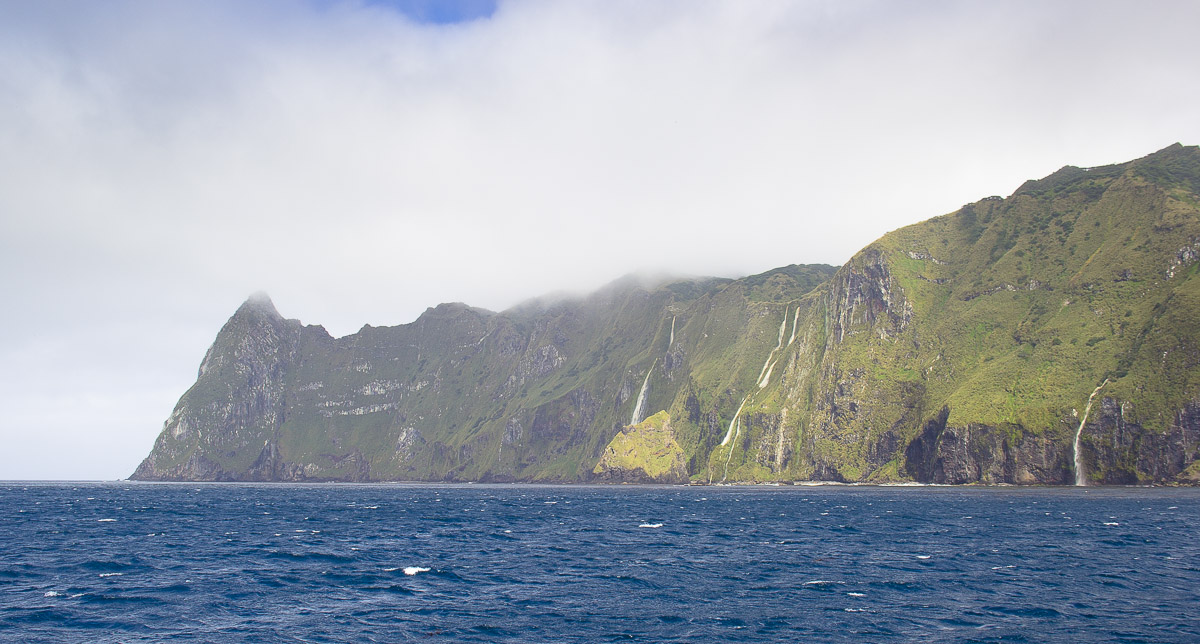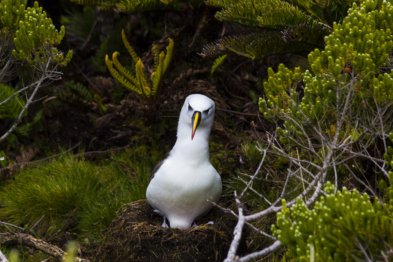 Debido a las tempestuosas condiciones que azotan al archipiélago constantemente, aprovechamos los dos únicos días de calma para conocer la isla. Nuestro objetivo principal era observar y fotografiar a los coloridos y muy elegantes albatros de nariz amarilla del Atlántico. Para esto había que caminar entre la vegetación y los acantilados del volcán principal hasta llegar a la cima muy cerca del cráter. Un isleño guía de vida salvaje nos recogió en una clásica “Defender” con la cual nos trasladamos al pie del volcán y así dimos inicio a una ardua y muy empinada caminata. Al llegar a la cima una fuerte sensación de prehistoria invadió mi ser. Era como un Edén de aves, adornado con diferentes especies de helechos como aquellos que se aprecian en las representaciones de paisajes jurásicos por donde alguna vez deambularon los dinosaurios. Habíamos llegado en plena temporada reproductiva, por lo que tuvimos el privilegio de observar a los albatros custodiando sus nidos, cortejándose o planeando entre los acantilados, un espectáculo. Tras haber logrado el tan deseado objetivo de ver a estas aves oceánicas, iniciamos el descenso. Teníamos que dejar la isla ese mismo día sí o sí. Una nueva racha de fuertes vientos y oleaje iban a golpearla nuevamente.