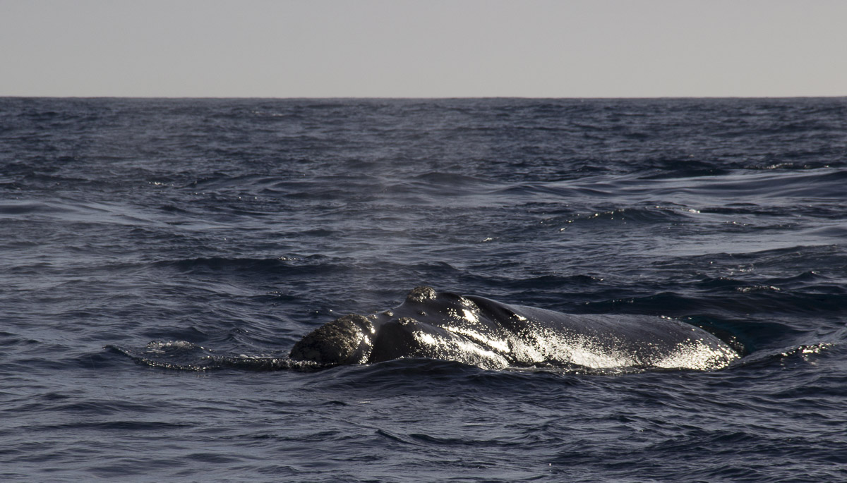 Un día antes de llegar a Sudáfrica, vimos a lo lejos una enorme ballena franca austral, las cuales se reproducen en costas sudafricanas durante los meses de invierno y luego migran hacia la convergencia antártica para alimentarse durante el verano. El enorme cetáceo llevaba un rumbo perpendicular hacia Tranquilo. Poco a poco nos fuimos acercando hasta llegar casi a la intersección. El coloso o la colosa no se percató de nuestra presencia sino hasta el último segundo cuando viró rápidamente para evitar el choque. Metros después salió nuevamente a la superficie y dio un soplido acompañado de un fuerte sonido, como protestando por haberla asustado y diciendo: ¡Fíjense por donde van!