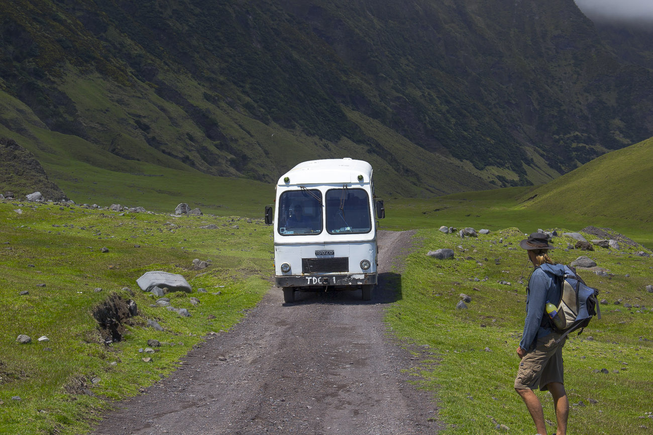 Al llegar a Tristan nos recibió Conrad Glass. Conrad es el único policía y jefe de migraciones de Tristan da Cunha. Todo un personaje en la isla, con su uniforme policial británico, fue la primera persona que se dirigió a nosotros. El resto de pobladores nos miraban con curiosidad. No era para menos. La única manera de llegar a Tristan da Cunha era en un algún buque inglés con provisiones o en algún costoso crucero. Quizás hayamos sido los únicos turistas en todo el año, así que todo el cariño y energía del pueblo recaía en nosotros.