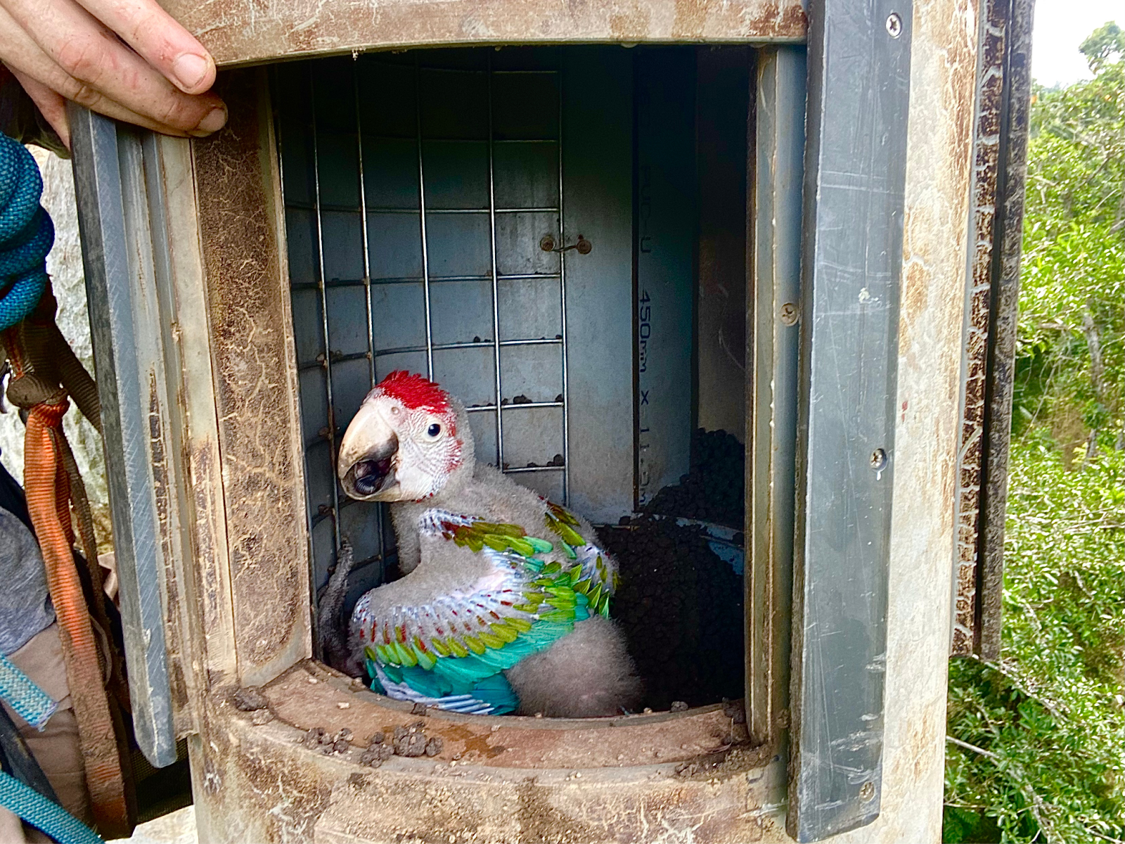 Foto: Pichón de guacamayo aliverde (Ara chloropterus)  en un nido artificial