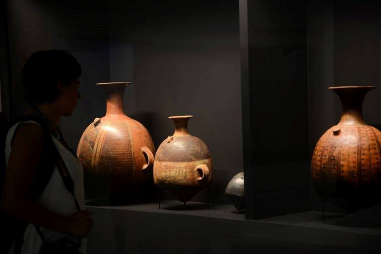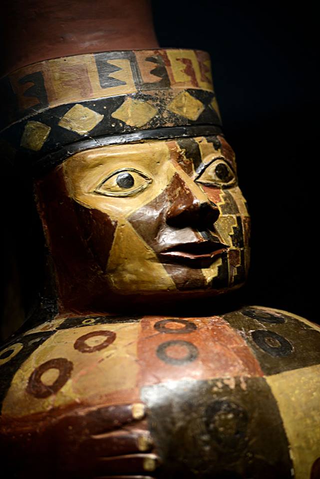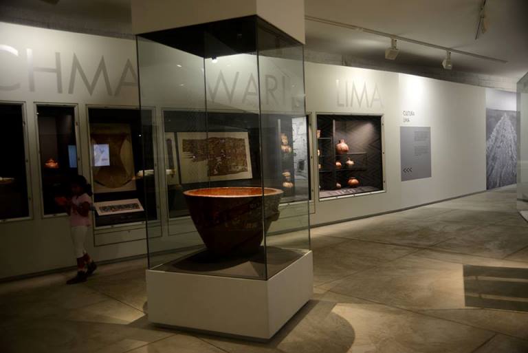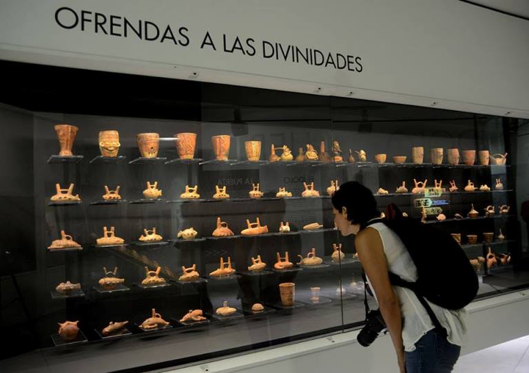 La sala de exhibiciones reúne 280 piezas de una colección de lujo donde destacan los 39 quipus, las cuerdas anudadas que registraban información contable, encontrados en su mayoría en el Templo del Sol y en la Pirámide con Rampa n° 3. También la colección de ceramios, algunos de ellos catalogados como obras maestras: la botella escultórica donde se aprecia a tres personajes usando un telar vertical; el cántaro que inmortaliza a un perro peruano sin pelo, a una perra deberíamos decir, amamantando a su prole y el huaco escultórico y anaranjado que representa a un ave. Ni qué decir de los trabajos en madera, en cuero, en mate, el arte plumario, las figuras en plata que terminan de explicar la ocupación del sitio arqueológico que se visita, que fue poblado en tiempos prehispánicos, lo señalan los paneles interpretativos del museo, por habitantes de las llamadas culturas Lima, Wari, Ychma e Inca.