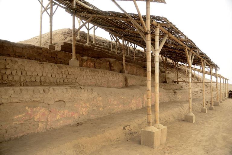 “El encuentro ocurrió justamente aquí, conversamos ahora con Janet Oshiro, arqueóloga por la Universidad de San Marcos y miembro del equipo de investigación que dirige Denise, en el Templo Pintado, un edificio construido en tiempos de los ychmas, antes del dominio inca, cuyas pinturas murales en ocre y amarillo fueron estudiadas por Max Uhle”. En esta misma zona, en 1938, el norteamericano Albert Giesecke encontró al llamado ídolo de Pachacamac, un madero tallado que reproduce la imagen del dios venerado en el oráculo y los restos de una puerta con incrustaciones de mullu (Spondylus spp) que se supone permitía el ingreso a la cámara donde se encontraba el báculo.